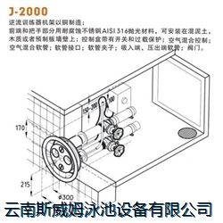 J-2000型噴浪裝置(逆流游泳訓(xùn)練器)為一個完整的系統(tǒng),其獨(dú)立于循環(huán)過濾系統(tǒng)之外。水泵運(yùn)行時,水從不銹鋼面板側(cè)面的吸水口經(jīng)由回水管進(jìn)入水泵,再經(jīng)由出水管,通過不銹鋼面板正面的兩個噴水口各噴出一柱平穩(wěn)有力的水流,當(dāng)游泳者正面面對不銹鋼面板游泳時,可實(shí)現(xiàn)定點(diǎn)游泳,從而造就“無末端游泳池”,也被稱之為“水中跑步機(jī)”。